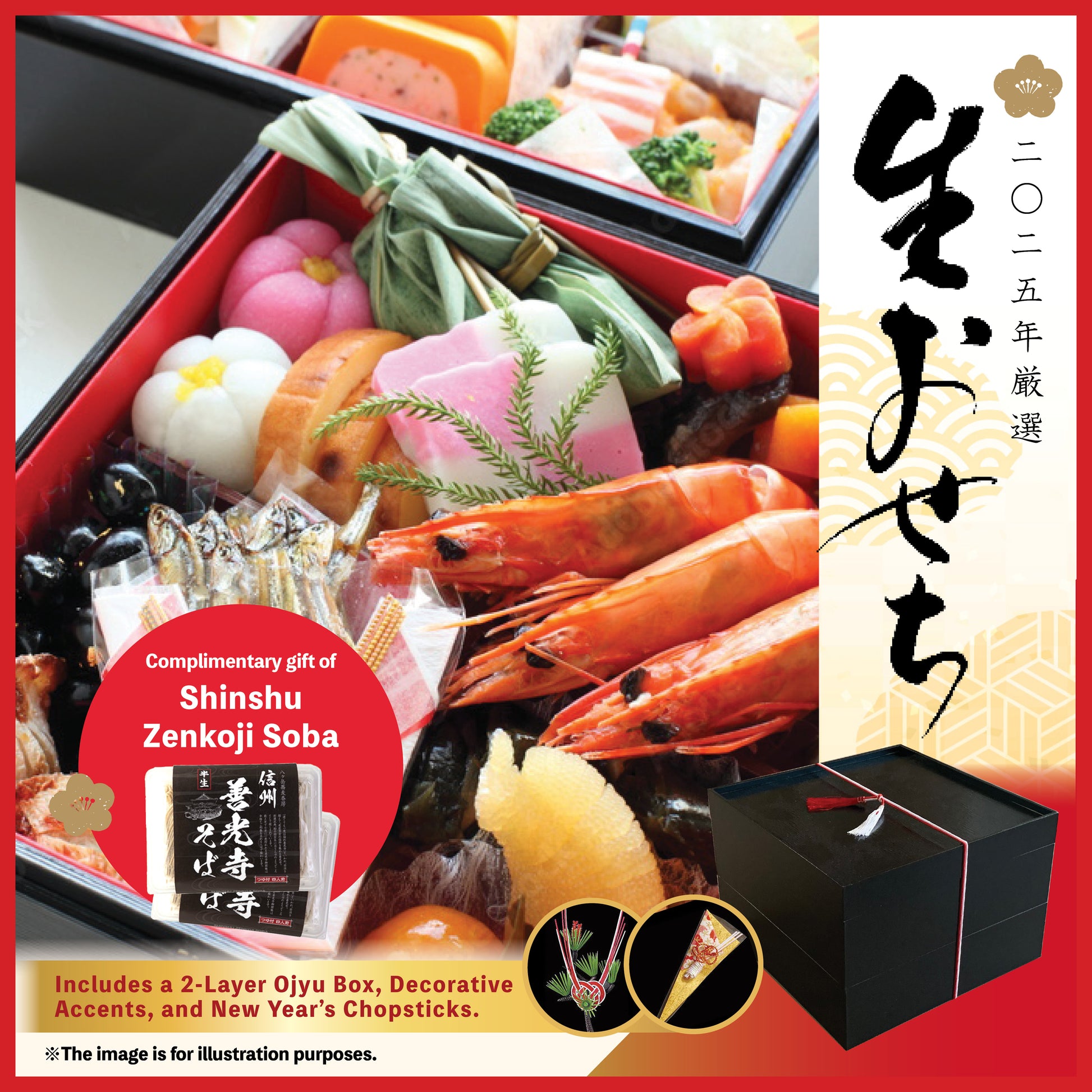 Enjoy the freshly made Osechi Box (Japanese Traditional New Year's Food). Shipped in 2 Layer Ojyu Box and Chopsticks. This beautiful and colorful Japanese traditional cuisine focuses on tasteful seafood varieties. It is perfect for experiencing Japanese tradition with celebration of New Year in Japanese style.
